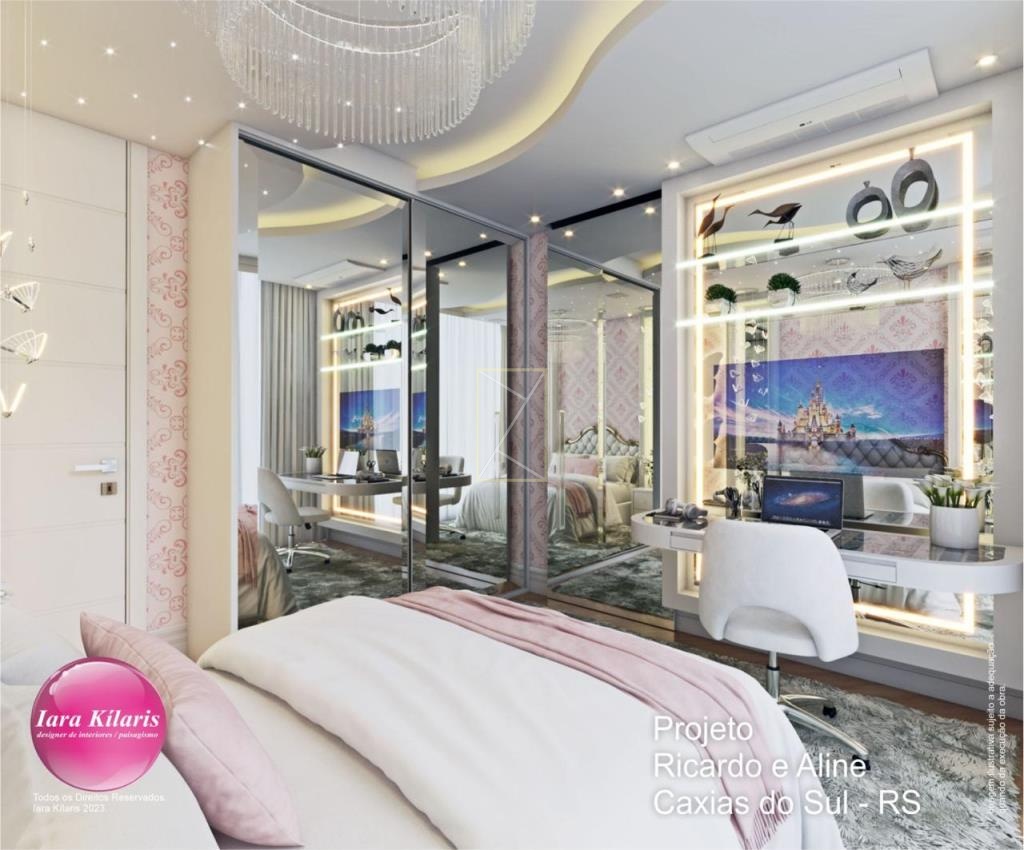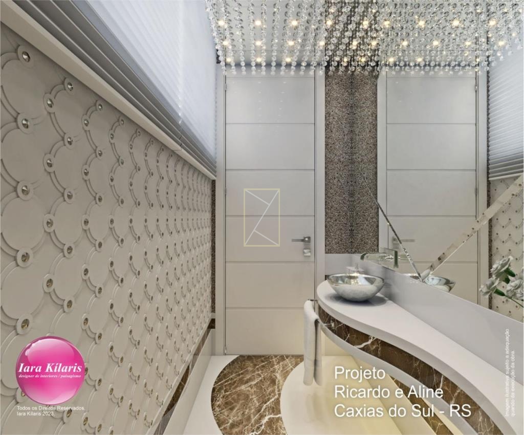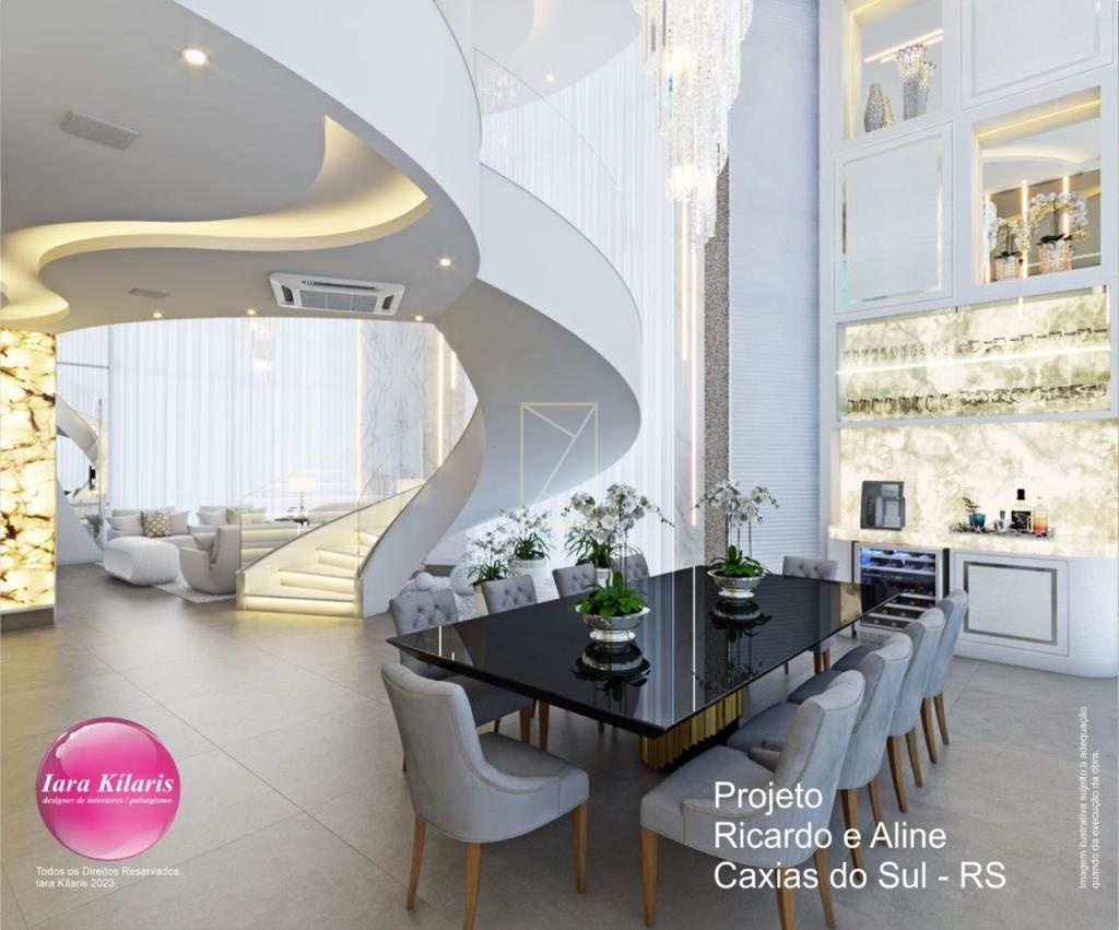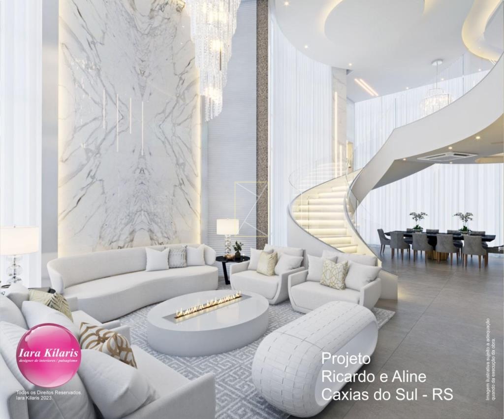 A casa conta com 3 suítes com sacada, sendo 1 suíte máster com closet, banheira de hidromassagem e sacada privativa. A área social possui living com pé-direito duplo, sala de estar com lareira, sala de jantar, lavabo e cozinha integrada ao living, proporcionando amplitude e integração entre os ambientes.