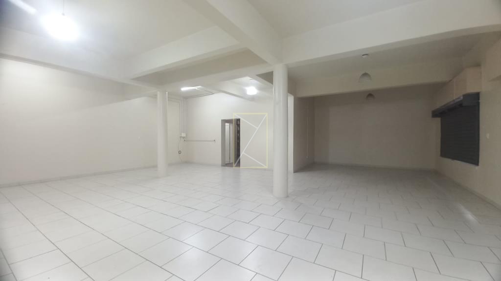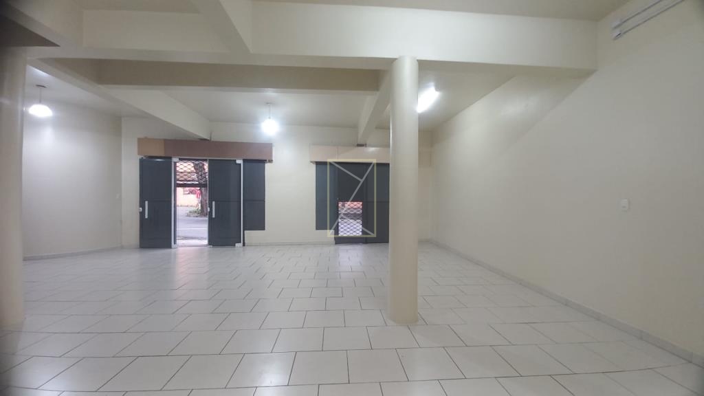 Loja térrea de esquina com vitrine, cortinas de ferro, 01 banheiro, porta interna de vidro e luminárias.