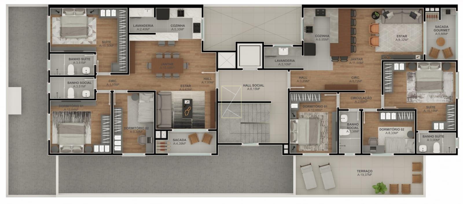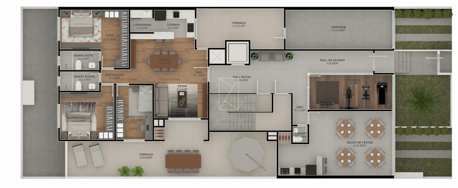 São 99 m² privativos.