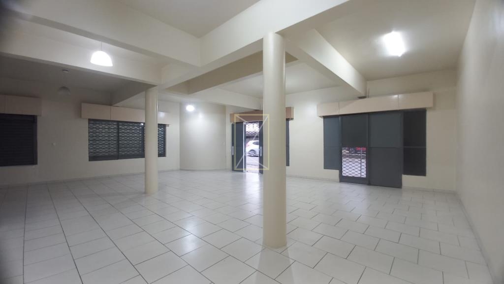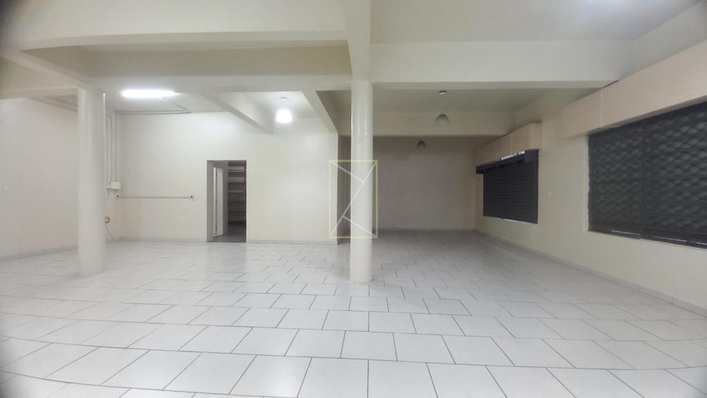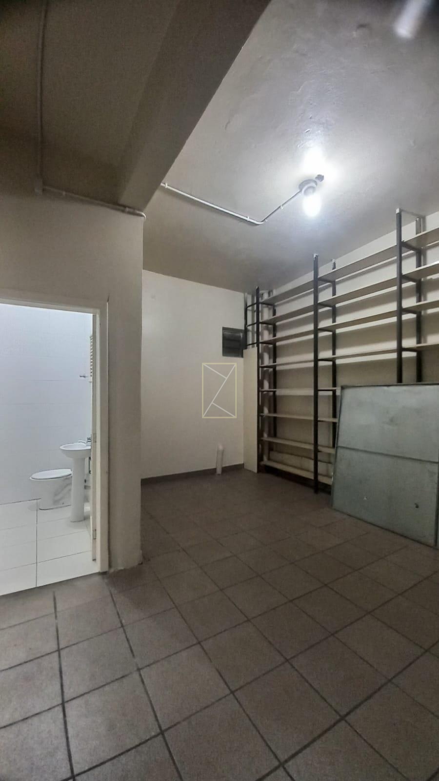 Loja térrea de esquina com vitrine, cortinas de ferro, 01 banheiro, porta interna de vidro e luminárias.